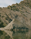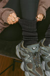 Flat lay side view of the slouchy coal Scrunch Sock with extra long ribbed cuffs