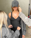 Front view of model posing in the oversized comfortable washed black french terry Oversized Zip Hoodie with a full length front zip closure, side pockets and thumbholes in the fitted cuffs