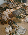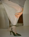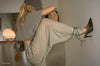 Close up side view of model adjusting the slouchy, pull on army luxe knit Leg Warmers that can be worn pulled up on scrunched down