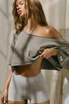 Front view of model posing in the slouchy storm sherpa V Neck Pullover sweatshirt with a wide V-neckline that can be worn on or off the shoulders.