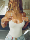 Front view of model posing in the fitted, full length vintage black flexrib Henley Tank with a notched henley neckline